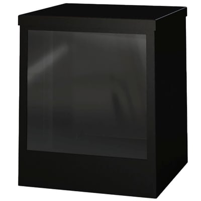 Pelmondo Stock træpillebeholder med ESG glasfront og hjul, udført i sort stål med pulverlakering.