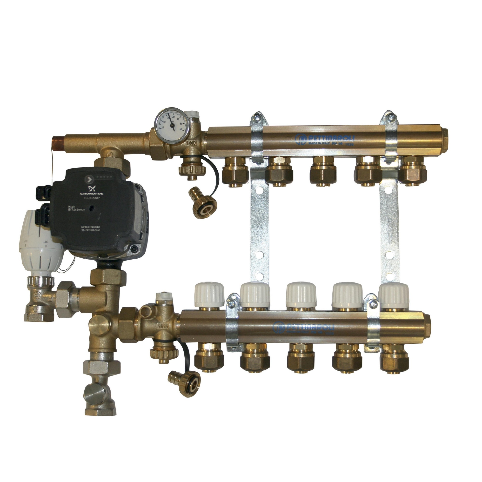 Komplet gulvvarmefordeler med 6 kredse. Shunt med ALPHA pumpe, 3/4" fordelerrør og 20 mm PEX fittings. Kræver modulerende styresystem for optimal lastfordeling.