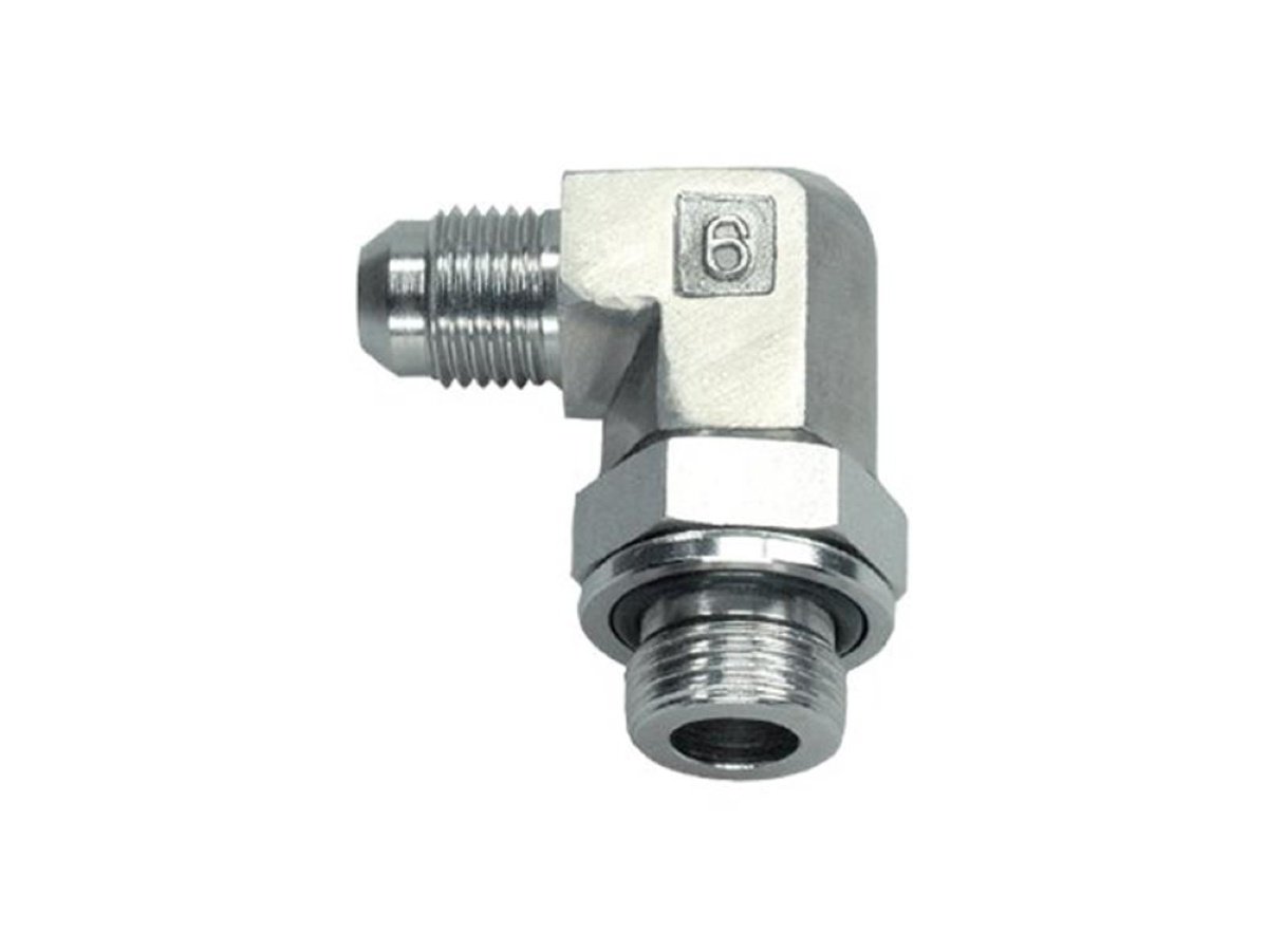 Syrefast vinkel med JIC udvendig gevind og drejelig BSP udvendig gevind med o-ring. Til udkravning af hydraulikrør med 37 graders konus.