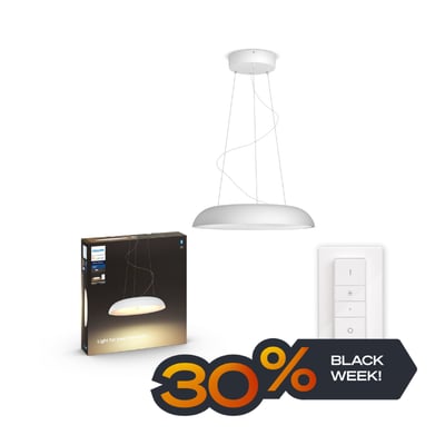 Philips Hue White Ambiance Amaze pendlen i hvid har et unikt design, der passer perfekt ind i alle køkkener og stuer. Få et naturligt varmt til køligt hvidt lys med de indbyggede belysningsløsninger og den medfølgende Hue Dimmer switch eller via Bluetooth. Tilføj en Philips Hue Bridge, og få adgang til samtlige intelligente belysningsfunktioner.
