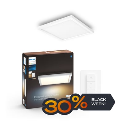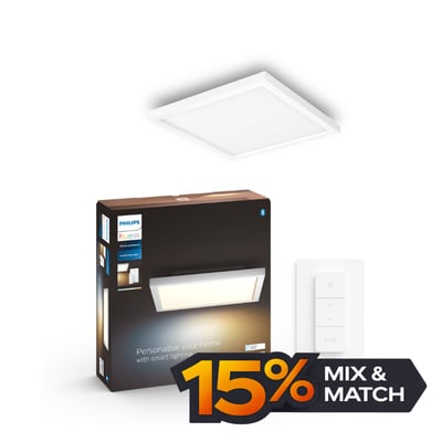 Firkantet Philips Hue Aurelle lyspanel med White Ambiance, integreret LED og Bluetooth. Styr lyset via app eller den medfølgende Hue Dimmer switch. Tilføj en Hue Bridge for flere funktioner.