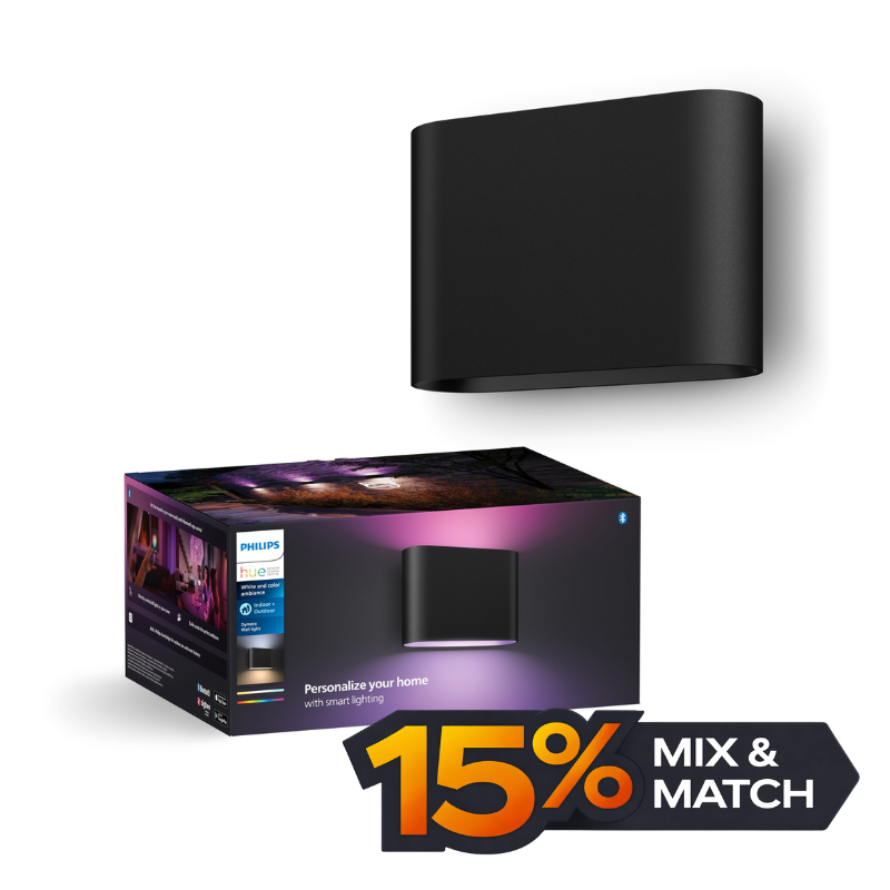 Som alle farvekompatible lyskilder fra Philips Hue, giver Dymera dig adgang til millioner af farver og nuancer af hvidt lys. Sæt den perfekte stemning til enhver lejlighed – fra en stille, romantisk middag til en stor havefest. Lampens enkle og moderne udseende passer perfekt ind i enhver indretning, og de opad- og nedadrettede lyseffekter fremhæver dit hjems arkitektoniske detaljer.