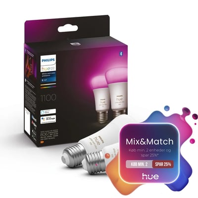 *Tilbuddet gælder 9 marts 2026 til 22 marts 2026 ved køb af min. 2 Philips Hue varer med Mix&Match badget på varen. Rabatten fratrækkes automatisk i kurven