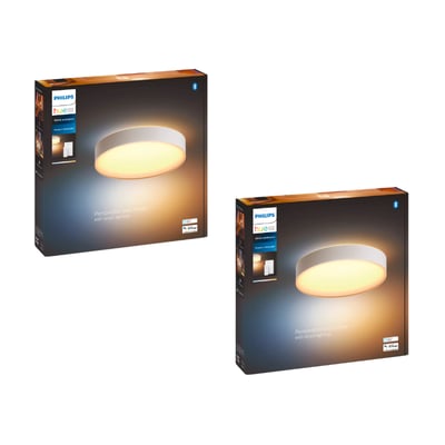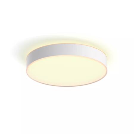 Philips Hue Enrave loftlampen i hvid er designet med et moderne udtryk og en bred lysvinkel. Denne store model er ideel til at oplyse større rum som eksempelvis stuen. Lampen afgiver et blødt lysskær mod loftet, samtidig med at den effektivt oplyser rummet med et kraftigt, nedadgående lys.