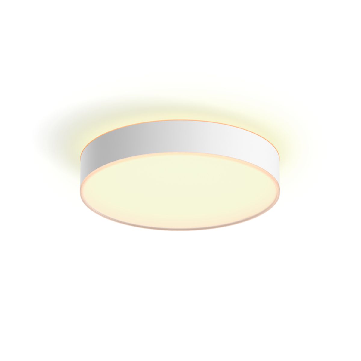Philips Hue Enrave loftslampe i hvid med White ambiance. Tilpas belysningen med kolde og varme hvide toner og fire forudindstillede lysscener. Styr via Hue app eller tilbehør.