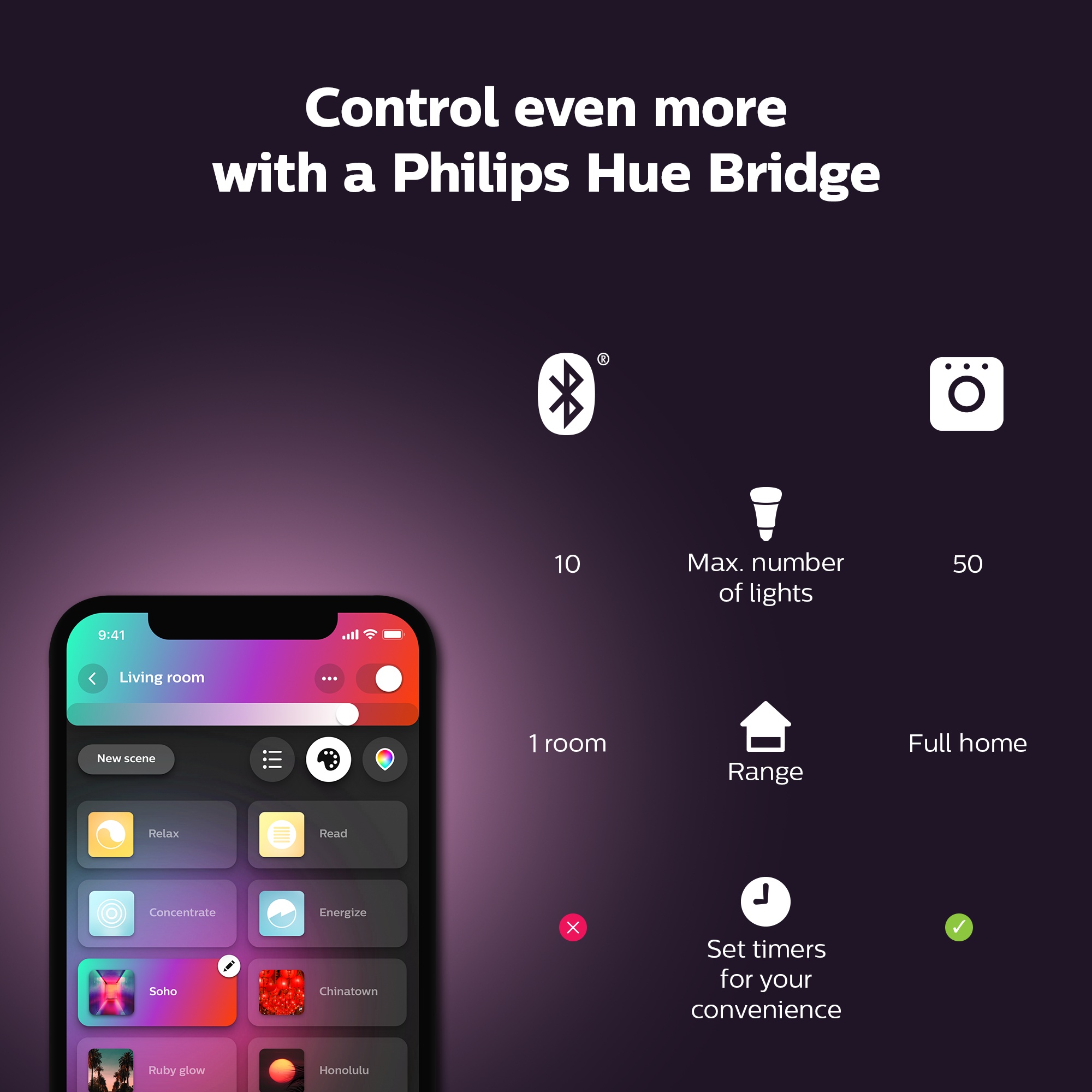Tilføj en Hue Bridge (sælges separat) og få adgang til alle Philips Hue funktioner. Med en Hue Bridge kan du tilføje op til 50 lyskilder og betjene dem overalt i dit hjem. Indstil rutiner, automatiser din belysning, betjen lyset når du er ude, og tilføj tilbehør som bevægelsessensorer og intelligente kontakter.