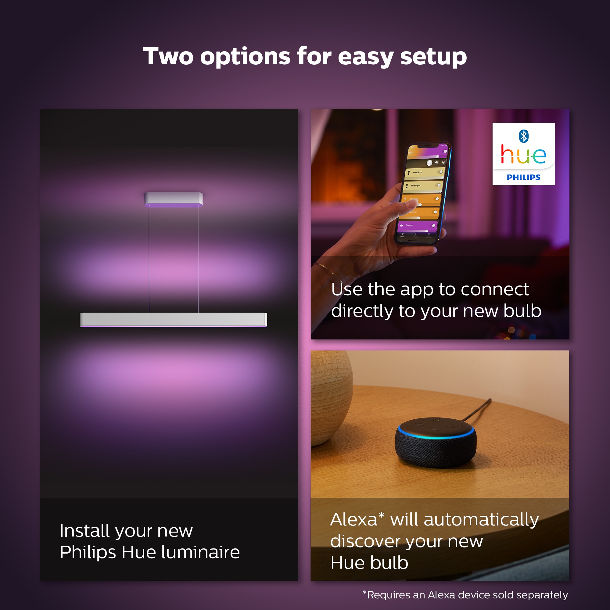 Philips Hue fungerer med Amazon Alexa og Google Assistant, når den er parret med en kompatibel Google Nest eller Amazon Echo enhed. Brug simple stemmekommandoer til at styre lyset i et rum eller en enkelt lampe.
