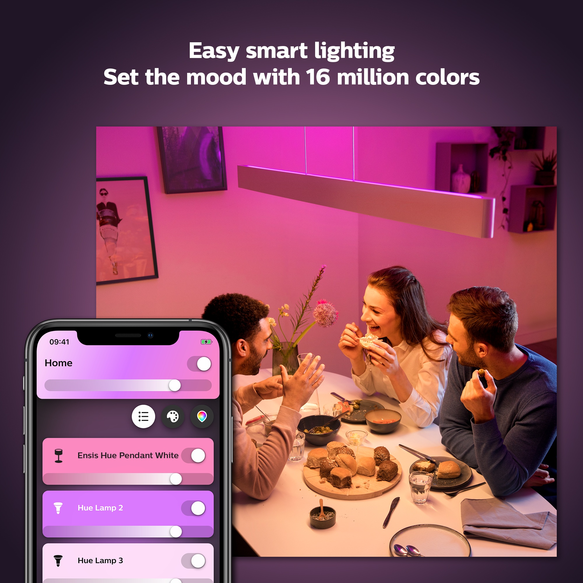 Vælg mellem 16 millioner farver og skab den perfekte stemning til enhver lejlighed. Farvesæt dit hjem og skab den rette atmosfære med et tryk på en knap.