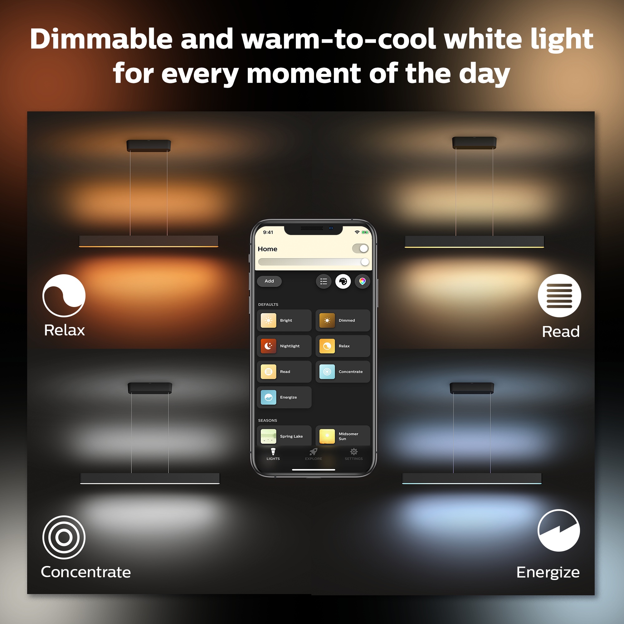 Gør hverdagen lettere med fire forudindstillede belysningsløsninger: Få energi, koncentrer dig, læs og slap af. De kølige nuancer i Energize og Concentrate hjælper dig med at komme i gang om morgenen og bevare fokus, mens de varmere scener Read og Relax er perfekte til en god bog eller afslapning.