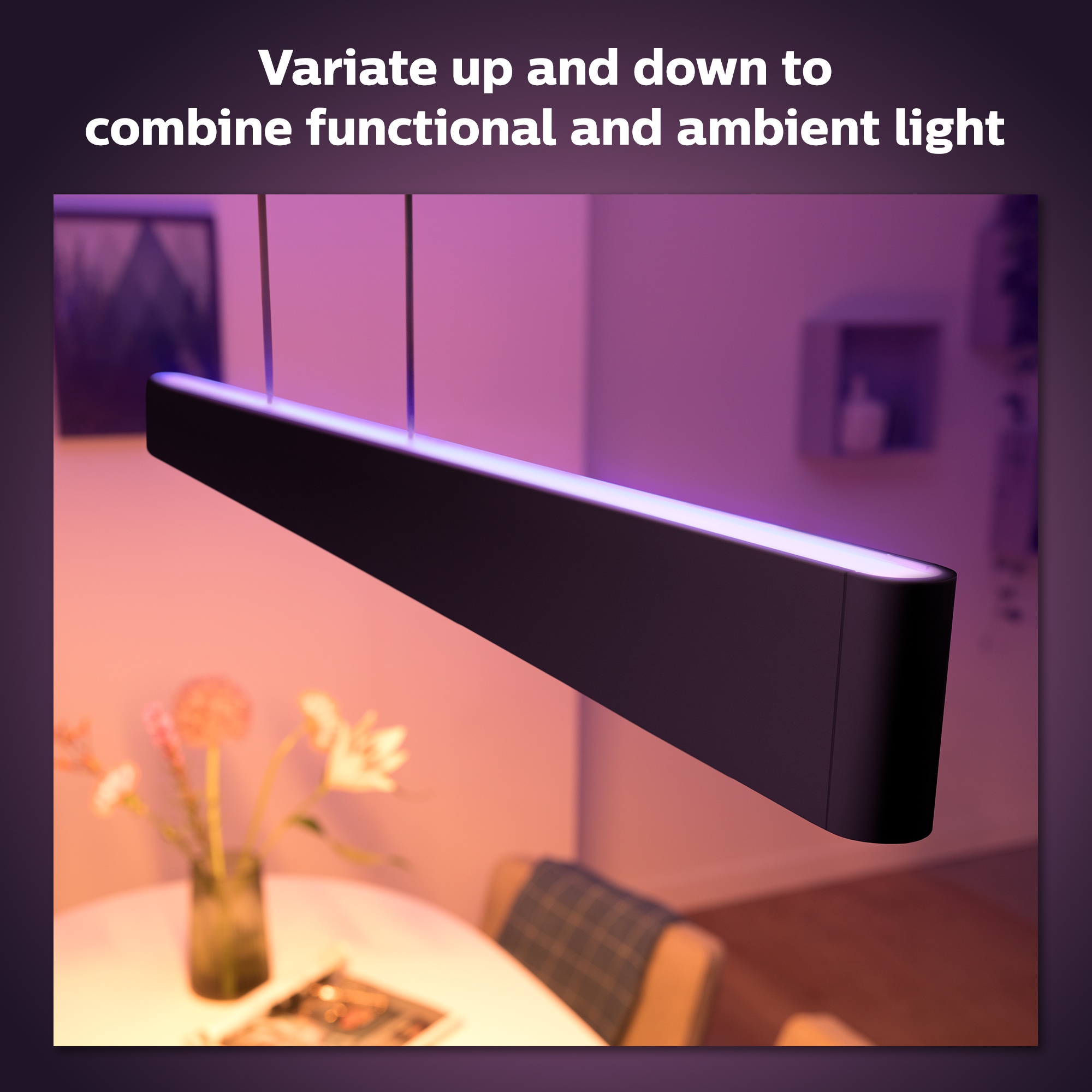 Philips Hue Ensis pendlen kombinerer et slankt design med både opad- og nedadrettet belysning, hvilket gør det nemt at forene funktionelt lys med stemningsfuld atmosfære. Lampen kan bruges alene eller integreres i dit intelligente belysningssystem via en Hue Bridge.