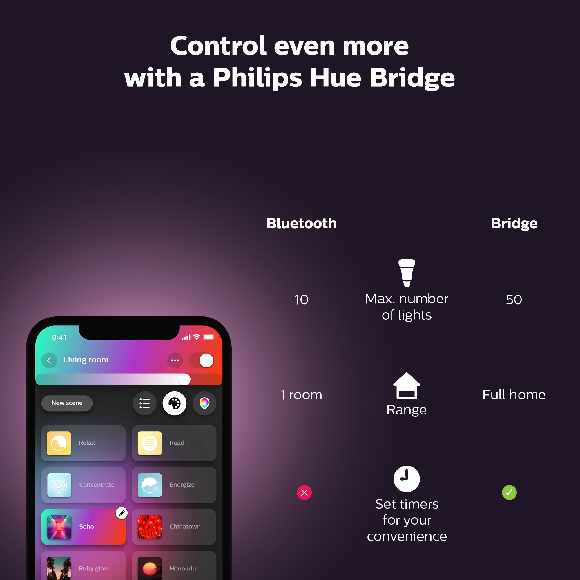 - Fuld adgang til alle intelligente belysningsfunktioner med Hue Bridge