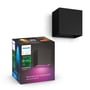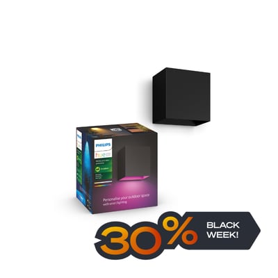 Philips Hue Resonate udendørs væglampe i sort. Skab stemning med farvet lys. Kræver Hue Bridge. IP44 godkendt. Mål: 12 x 12 x 9,3 cm.
