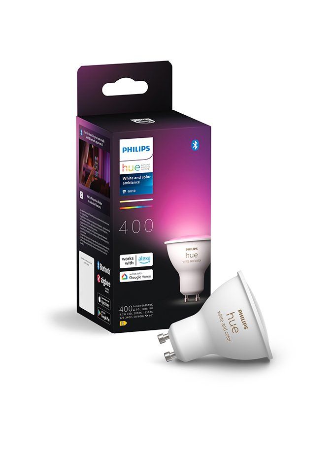 Philips Hue GU10 pærerne er det perfekte valg til dine spotlamper, og giver dig adgang til det bedste inden for intelligent belysning. Denne 1-pak indeholder en GU10-pære i serien White and color ambiance, der giver dig mulighed for at nyde både farverig stemningsbelysning og enhver nuance af varmt til køligt hvidt lys, der kan understøtte alle dine daglige aktiviteter.
