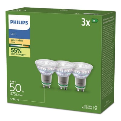 Philips Ultra Efficient GU10 LED-pære med 2,1W, 375lm og 2700K. Dæmper ikke.