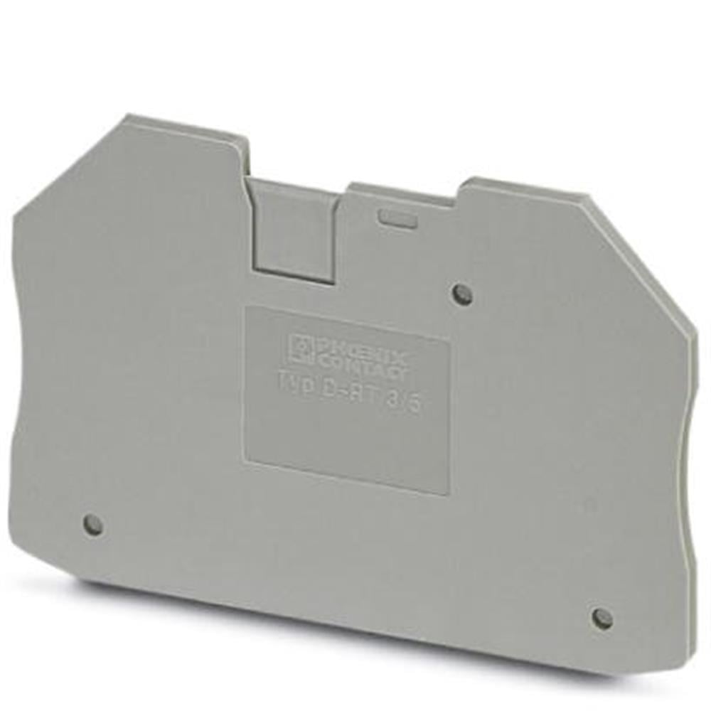 Denne grå endeplade D-RT 3/5 fra Phoenix Contact er designet til at give en sikker og pæn afslutning på dine DIN-skinnemonterede installationer.