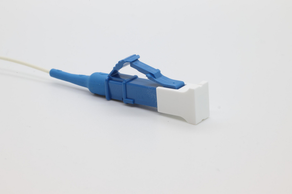 En pakke indeholder én pigtail i hvid farve. LC-konnektoren er blå med en blå boot.