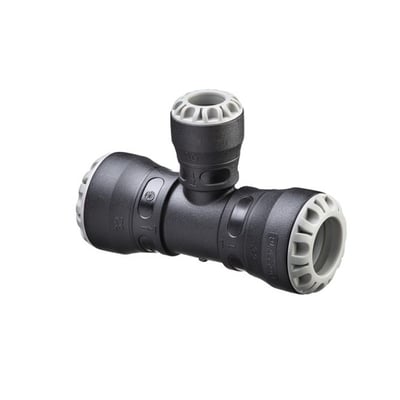 Robust Plasson T-stykke i PP, designet til vandinstallationer med en diameter på 50 x 32 x 50 mm og en trykklasse på PN16. Ideel til forgrening.