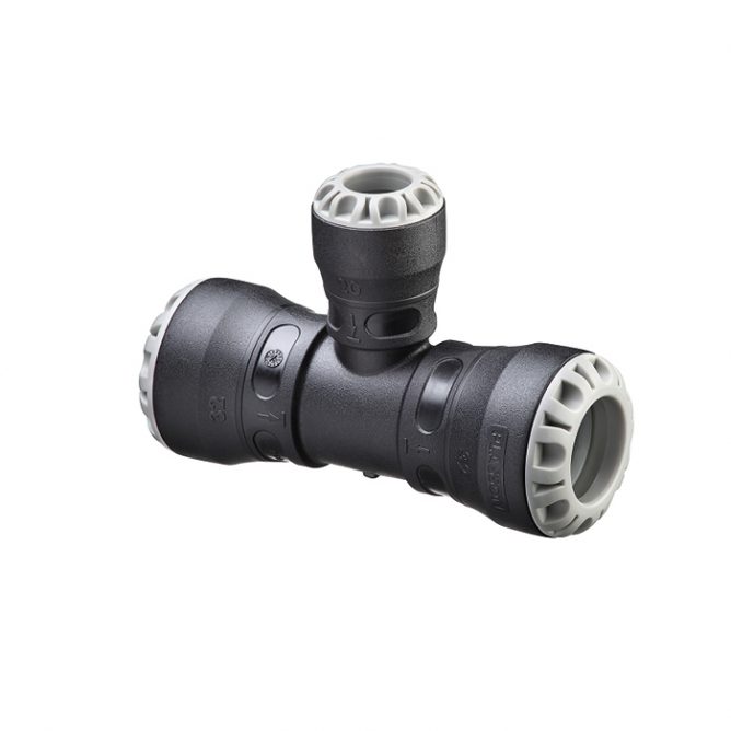 Plasson tee i PP med trykklasse PN16 og dimensionerne 32 x 25 x 32 mm.