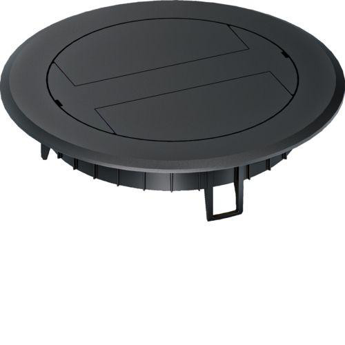 Sort klaplåg i plast (RAL 9005) med hængslet design, ideel til gulvinstallationer. Diameter: 150 mm (udvendig), 122 mm (hul).