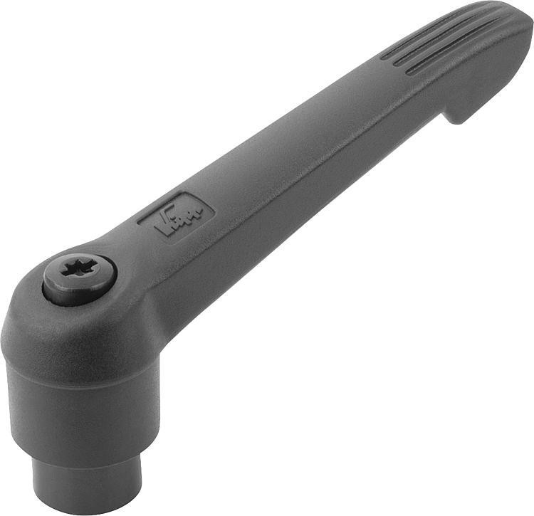 Spændehåndtag med håndtag i glasfiberforstærket plast og støbt zink fortandet ring. Ståldele i Grade 5.8 kvalitet og sort oxideret finish.