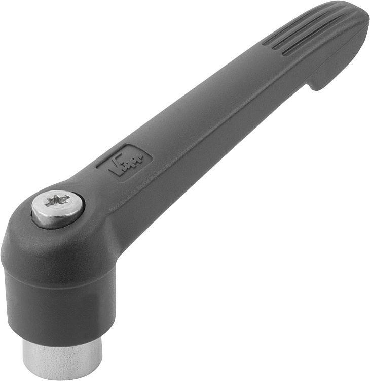 Spændehåndtag, størrelse: 2 - M8x15, plast, sort/grå RAL 7021, materiale: stål med udvendig gevind. Håndtag i glasfiberforstærket plast og støbt zink fortandet ring.