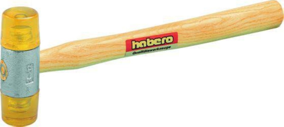 Robust plasthammer med Ø40 mm slagfaste celluloseacetathoveder og et slidstærkt skaft i asketræ. Ideel til præcisionsarbejde.
