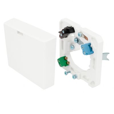 Kvadratisk komfurudtag i hvid plast med skrueklemmer og aflastning. Velegnet til vægmontering og indendørs brug i tørre omgivelser.