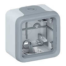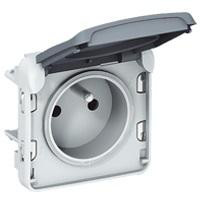 Plexo udtag 2P+J med pindjord, 2M, grå, IP55. 16A, 250V. Overholder fransk standard.