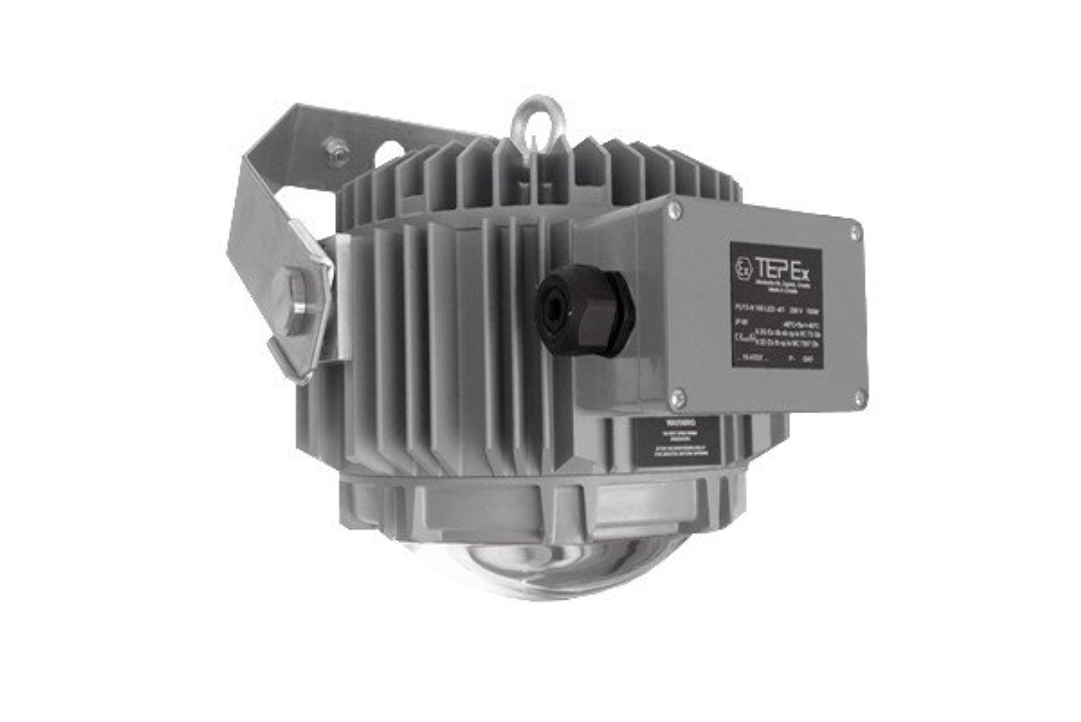 Eksplosionsbeskyttet PLFS-N 100 LED Ex spot/pendel til Zone 1, 2, 21 og 22. Designet til miljøer med antændelige dampe, brandfarlige gasser og brandbart støv.