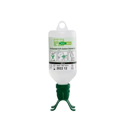 Ergonomisk flaske med 0,9% sterilt natriumklorid til hurtig og effektiv øjenskylning ved snavs og støv. DUO-øjenkop muliggør skylning af begge øjne samtidigt.
