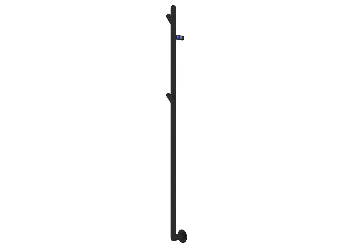 Stilren håndklædetørrer med 2 faste kroge og indbygget timerfunktion (2/4 timer). Kan tilsluttes synligt eller skjult. Findes i 5 overflader.