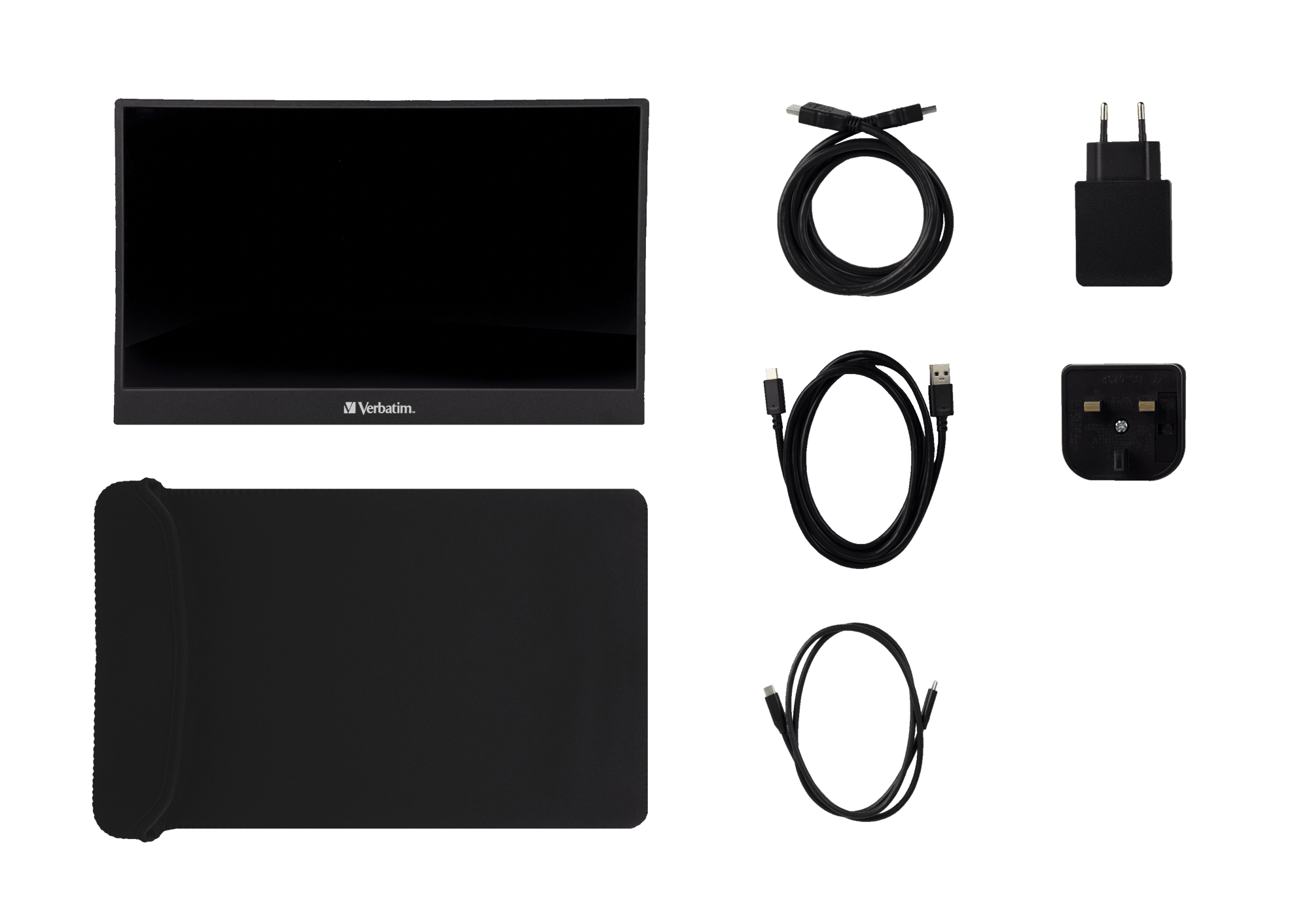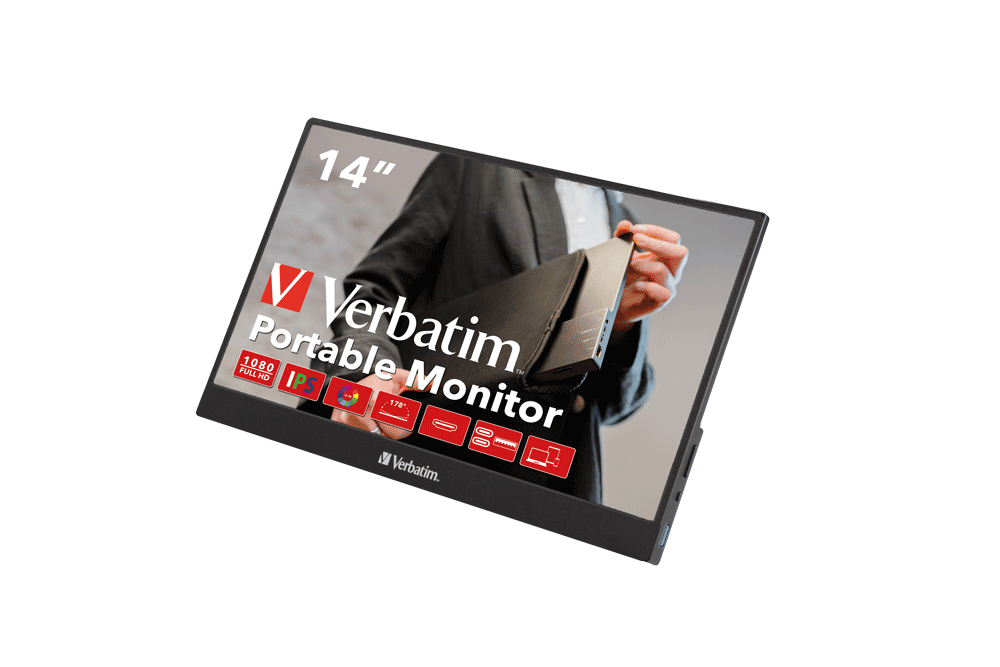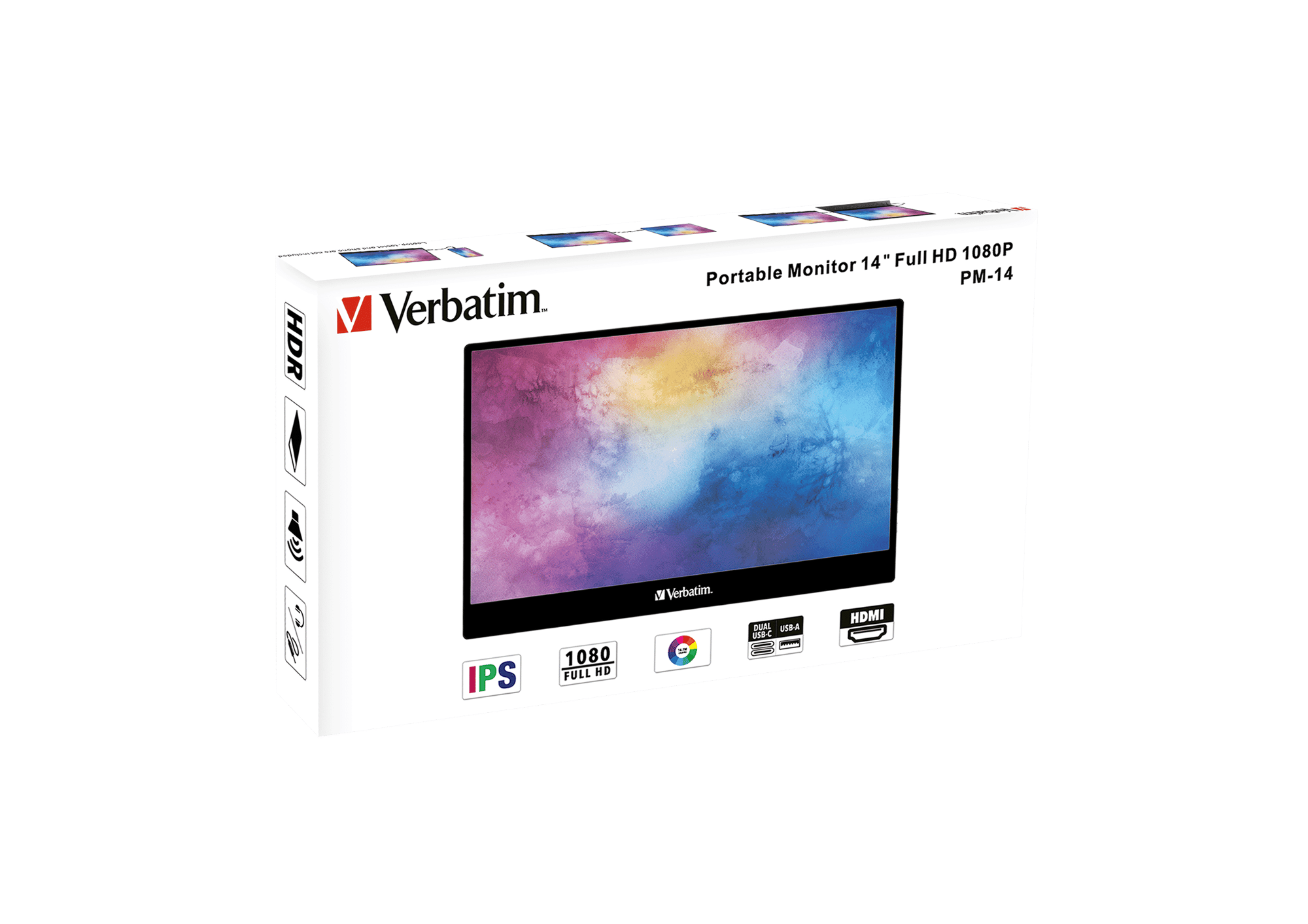 Verbatim PM-14 er en bærbar skærm med 14" Full HD 1080p opløsning og IPS-panel. Den har HDMI-port og en responstid på 6 ms.