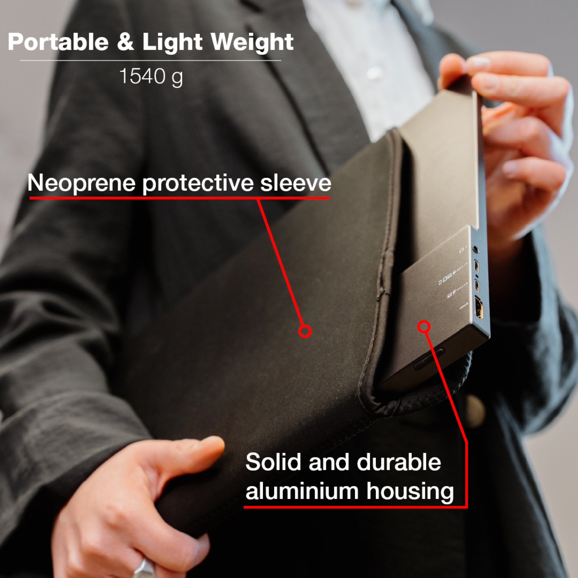 Skærmen er designet med et robust og elegant metalkabinet i sort, der både ser godt ud og beskytter enheden. Den tynde profil og lave vægt gør den ideel til at tage med på farten, uanset om du skal præsentere, arbejde eller underholde.