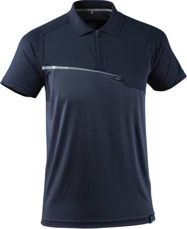 Funktionel poloshirt i mørk marine, størrelse M. Svedtransporterende, hurtigttørrende og antibakteriel. Moderne pasform med god bevægelsesfrihed, nakkebånd, lynlås i hals og brystlomme med lynlås.