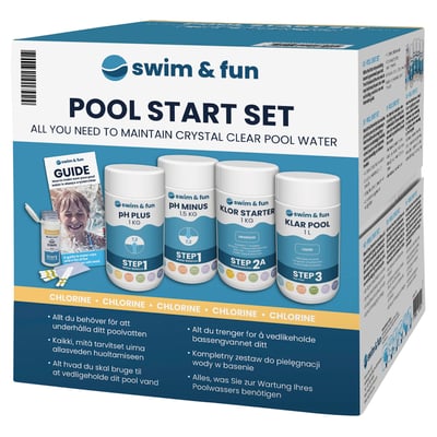 Startpakke med alle de plejemidler, der er nødvendige for at holde vandet i poolen rent og indbydende. Med et Pool Start Sæt er du sikker på at komme godt i gang med badesæsonen. Sættet indeholder alle de plejemidler, der er nødvendige for at holde vandet i poolen rent og indbydende, samt en overskuelig og informativ guide.