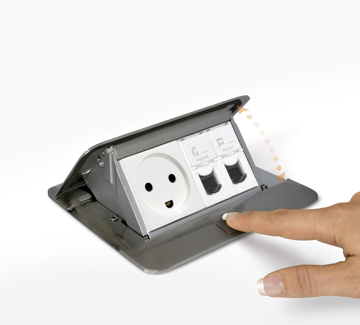 Legrands Pop-up boks giver en brugervenlig og hurtig tilslutning af mobilt udstyr som PC'er, mobiltelefoner, tablets, lyd- og videosystemer. Produktet overholder IEC 60670-1, IEC 60670-23 og IEC 60884-1.