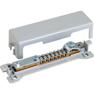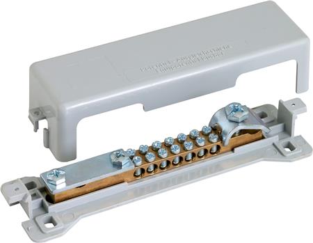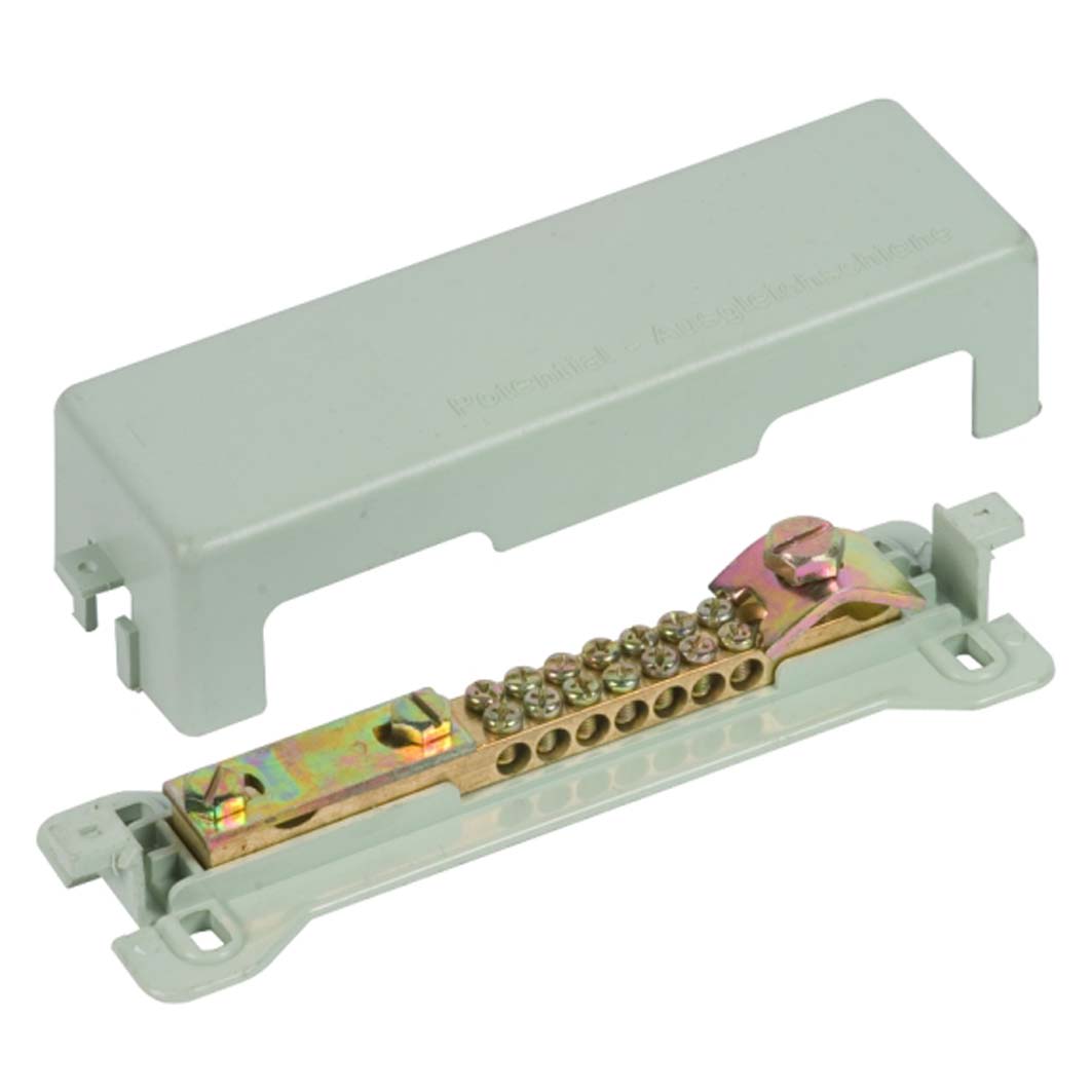 Potentialeudligningsskinne fra Desitek, fremstillet af messing og dækket med et plastiklåg. Sikrer effektiv potentialudligning i forskellige installationer.