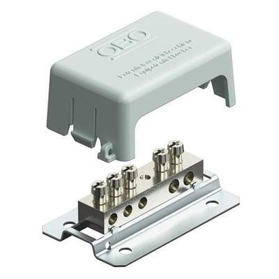 Potentialudligningsskinne med grå afdækning af polystyrol, der kan plomberes eller skrives på. Bundplade af galvaniseret stål og forniklet messing kontaktskinne.
