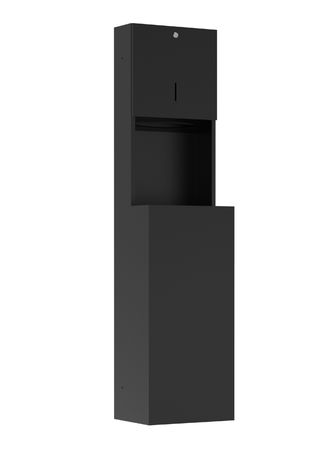 Modulet er udført i et stilrent, mat sort design, der passer ind i de fleste rum. Det leveres med ens cylinderlås til både papirdispenser og affaldsbeholder.