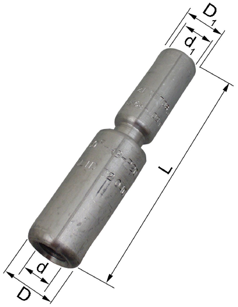 Aluminium samlemuffe AS95-50 med skillevæg. Til 95/50mm2 fåtrådige (klasse 2) og 120/70mm2 massiv (klasse 1) Al-leder. Rundpresning af leder kræves.