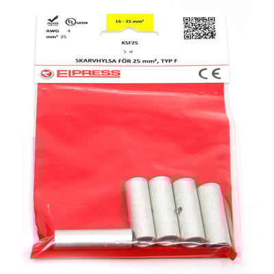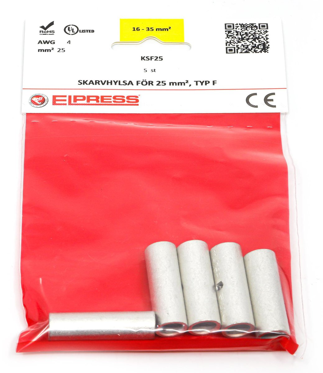 Kobber pressemuffe KSF25 fra Elpress, ideel til samling af kabler. Muffen er fremstillet af Cu 99,95% og fortinnet med Cu/Sn, hvilket sikrer en god og holdbar forbindelse.