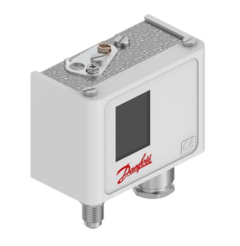 Danfoss KP1E pressostat med flare tilslutning. Reguleringsområde -0,2 til 7,5 bar. SPDT guld kontakt og IP44 kapsling.