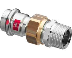 Prestabo overgangsbøjning 90° til varme-, køleanlæg og trykluft. Må ikke bruges til drikkevand. Med muffe, nippel og V bakke.
