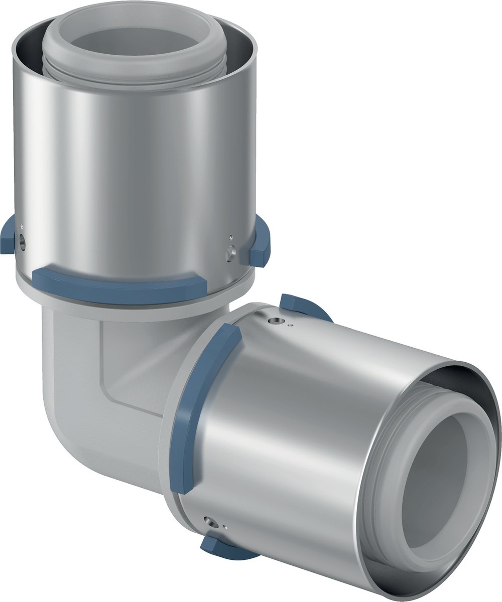 90° vinkel S-Press Plus fra Uponor i PPSU til MLC-rør (AluPEX). Nem installation uden kalibrering. 75 mm dimension.