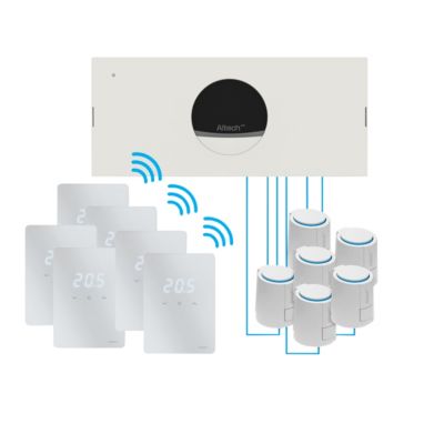 Komplet trådløst gulvvarmesystem med programmerbar styreboks, 6 rumtermostater og 6 telestater. Nem installation.