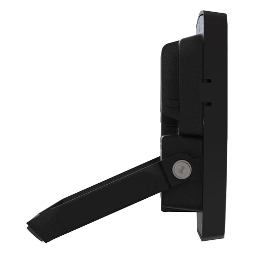 Den er konstrueret i holdbart aluminium med en sort finish og udstyret med en afskærmning i polycarbonat, der beskytter mod stød og vejrforhold. Med en IP65-klassificering er den fuldstændig beskyttet mod indtrængning af støv og vandstråler, hvilket gør den ideel til krævende udendørs miljøer. Projektøren er kipbar, hvilket giver fleksibilitet i justeringen af lysretningen.