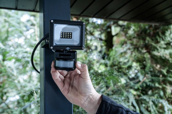 Kraftig 10W LED projektør med 1150lm lysstyrke, 6500K farvetemperatur og integreret sensor. IP65-klassificering.