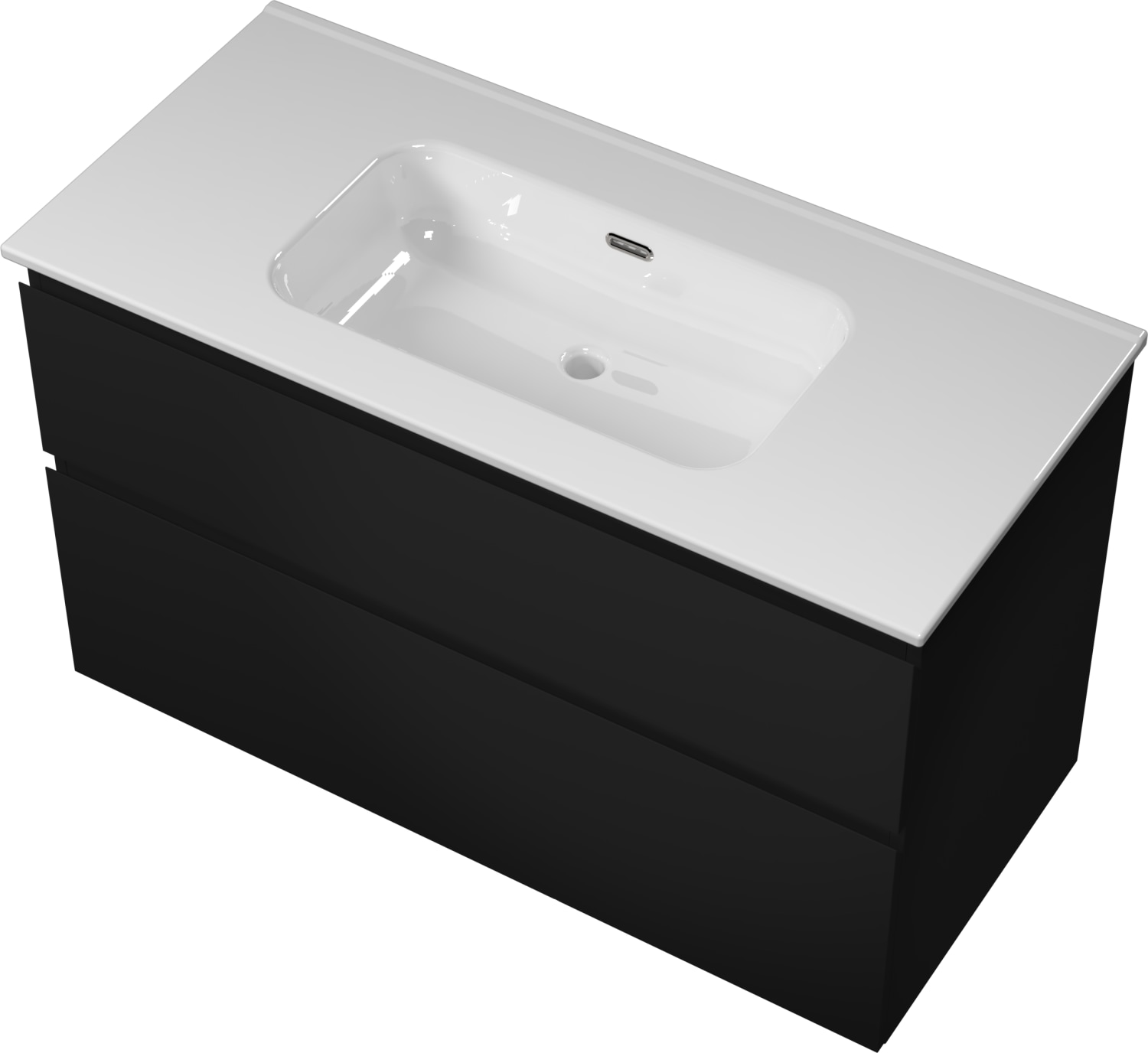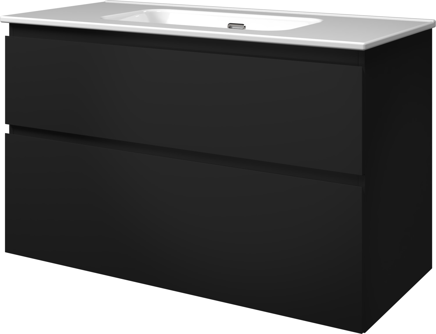 Møbelsættet er udstyret med to skuffer med soft close-funktion, hvilket sikrer en blød og lydløs lukning. Den matte sorte overflade giver et moderne og stilrent udtryk, der passer ind i de fleste badeværelser. De integrerede greb bidrager til et minimalistisk look.