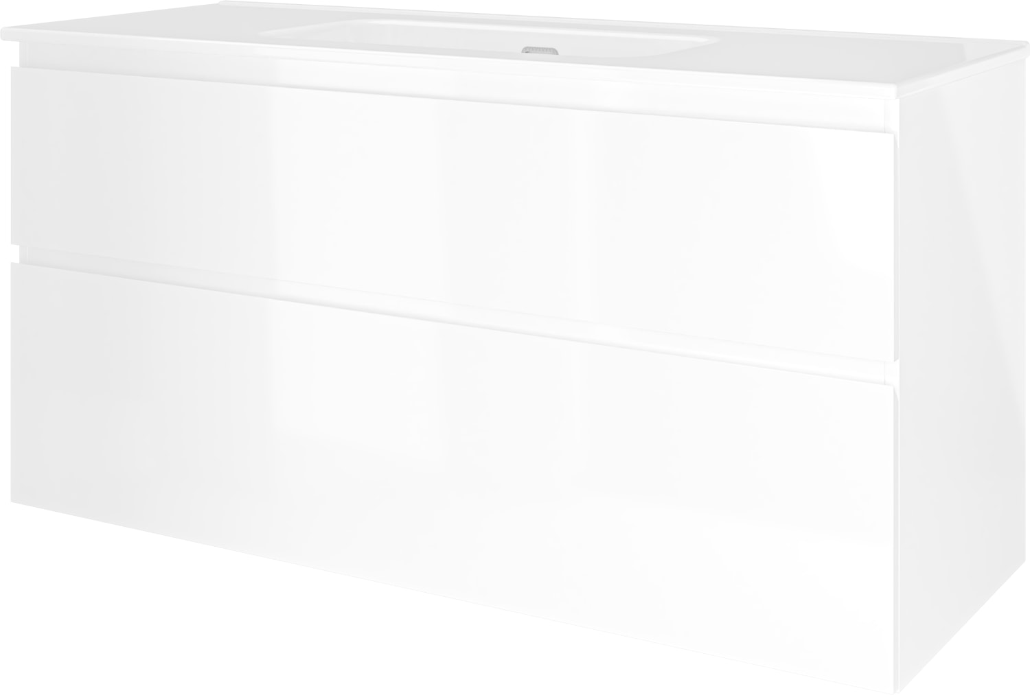 Elegant Proline møbelsæt i hvid højglans med softclose skuffer. Dimensioner: 121x46 cm.