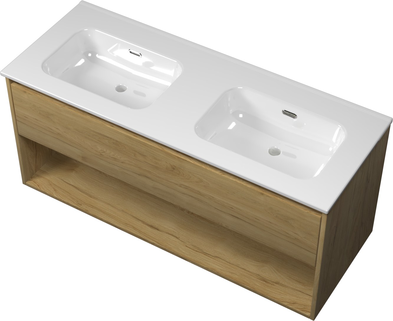 Sanibell Proline møbelsæt i ideal eg med 1 skuffe og 1 åben hylde. Mål: 121x46cm. Med soft close.